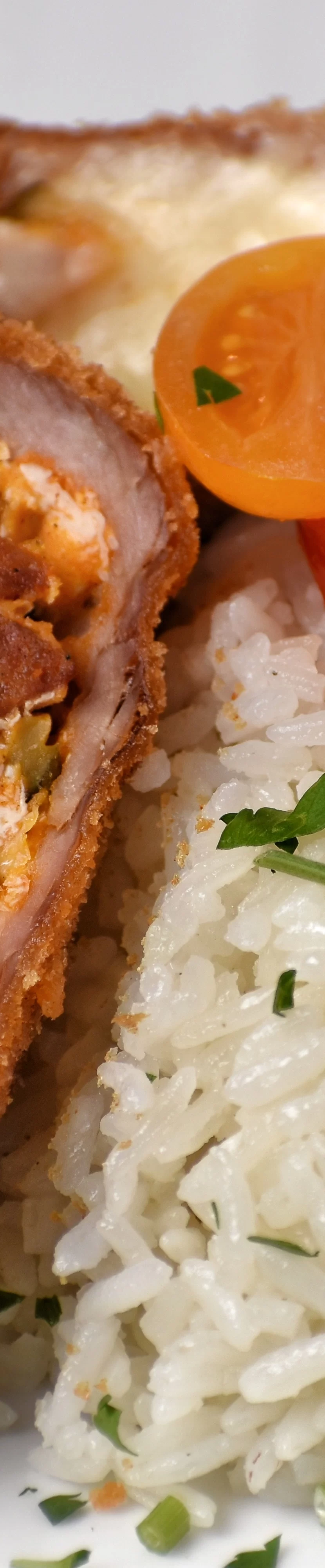 A sertésbordát vastagon megtöltjük parasztkolbásszal, sajttal, tojással, hagymával és csemegeuborkával, mustárral ízesítjük, majd panírozzuk és készre sütjük. Jázminrizzsel adjuk. (1, 3, 7, 9, 10)